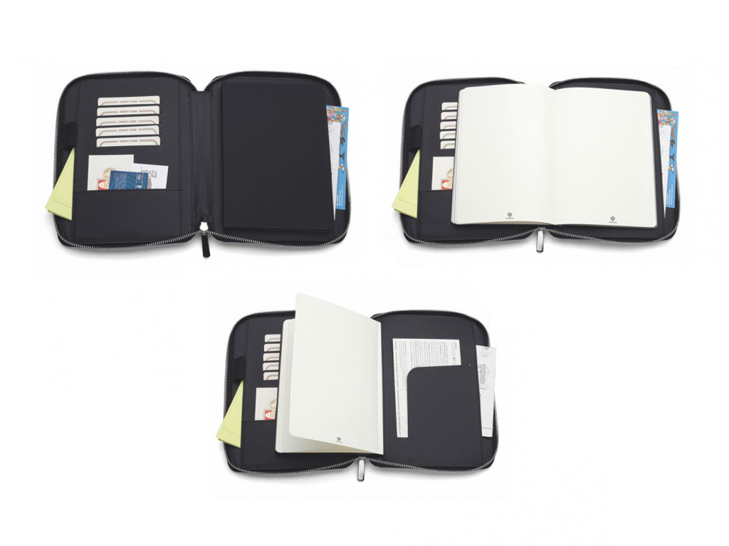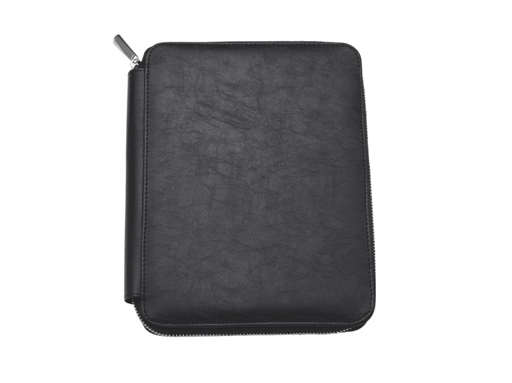 Cartella elegante in similpelle nera, con chiusura a zip per proteggere documenti e appunti. All’interno è presente un blocco note e spazi dedicati per penne e accessori.