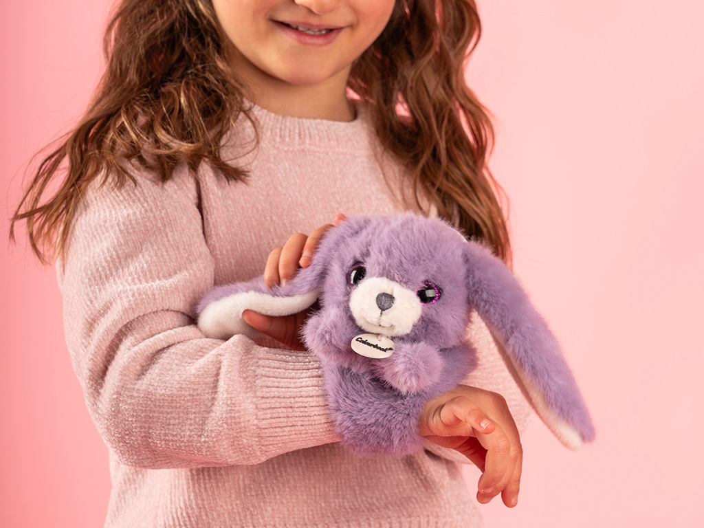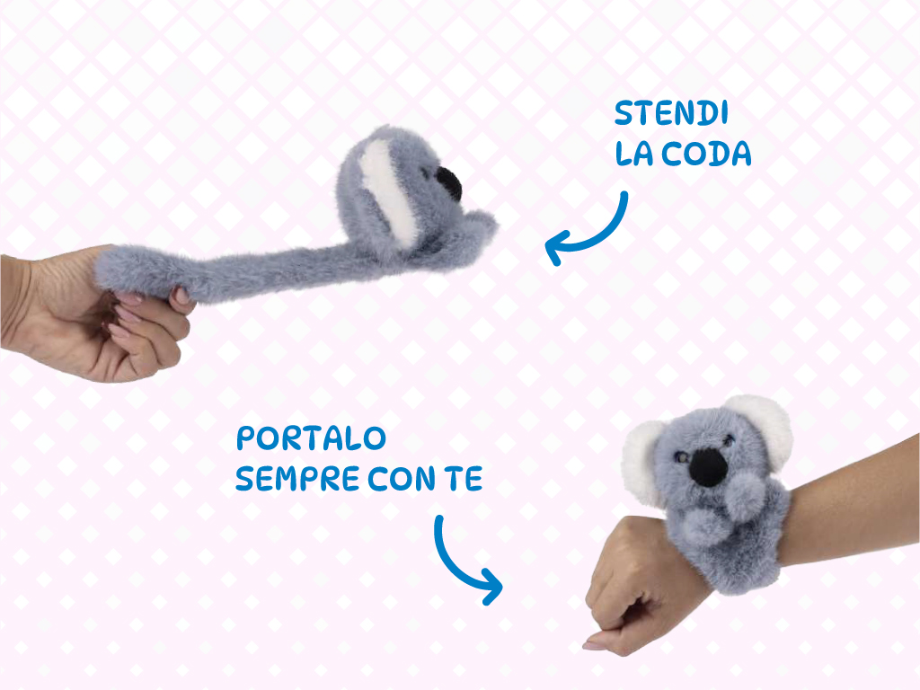 Realizzato in peluche extra-soft, si avvolge facilmente al polso o alla tracolla dello zaino grazie al pratico meccanismo slap-on, simulando un tenero abbraccio.