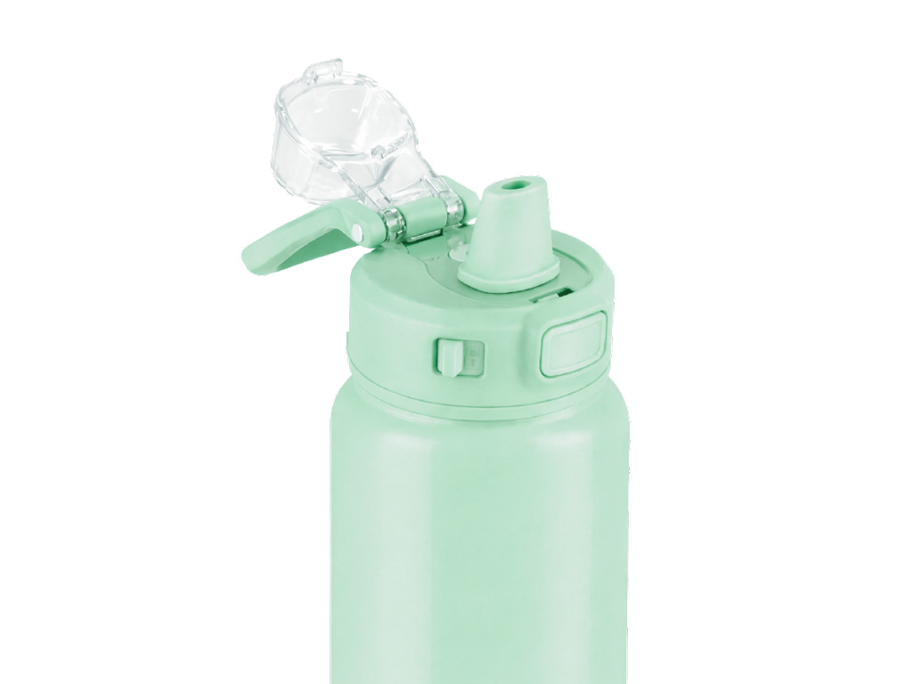 Il tappo a scatto con cannuccia in silicone consente di bere comodamente senza capovolgere la borraccia, mentre la sicura di protezione evita aperture accidentali. Il maniglione ergonomico facilita il trasporto e permette di agganciarla a zaini o moschettoni. Include spazzolino per la pulizia della cannuccia.