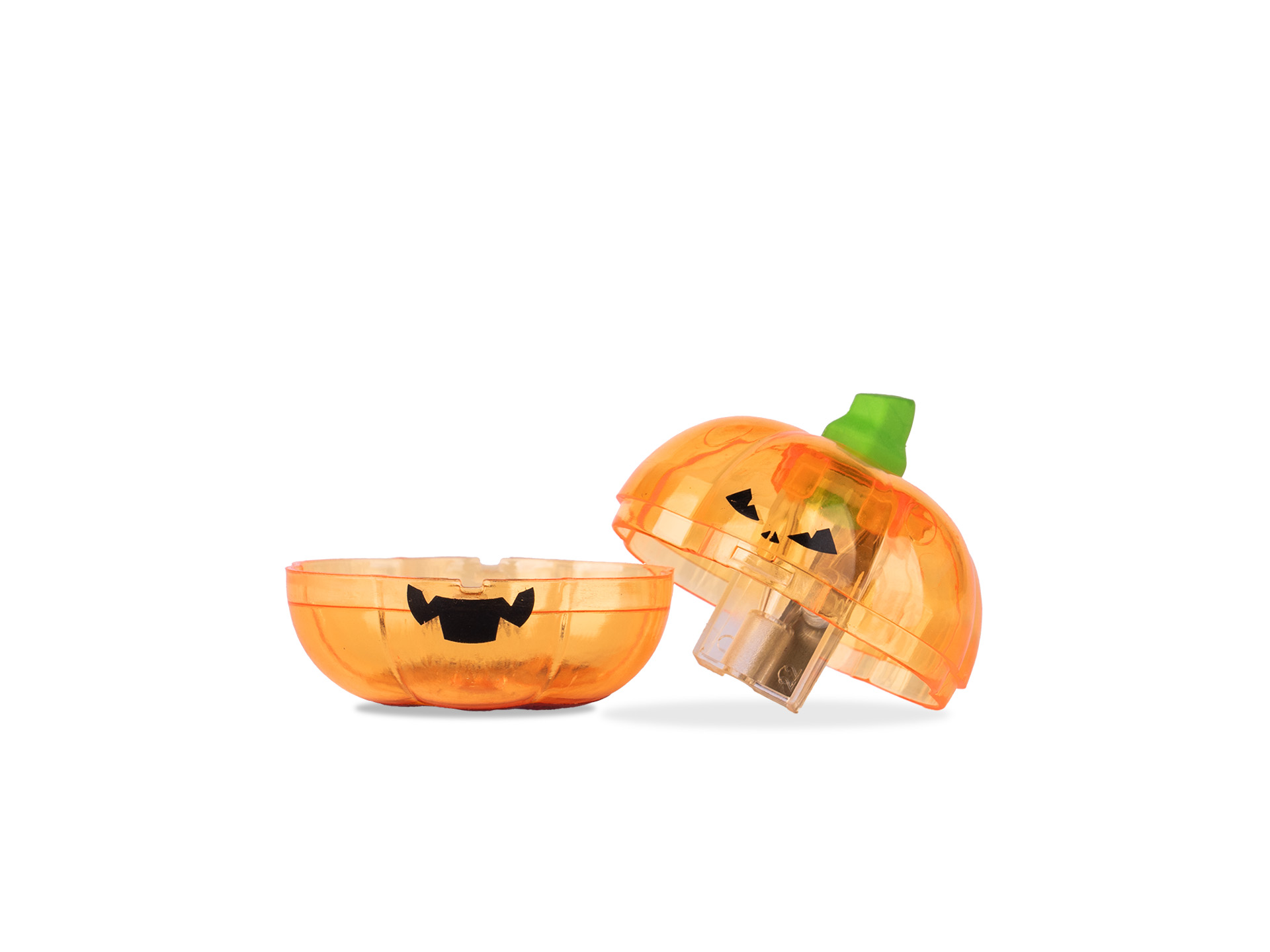 Temperino 1 foro con lama in metallo e contenitore per trucioli. Design a zucca trasparente con dettagli grafici a tema Halloween.